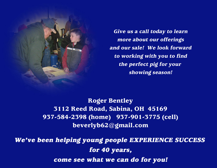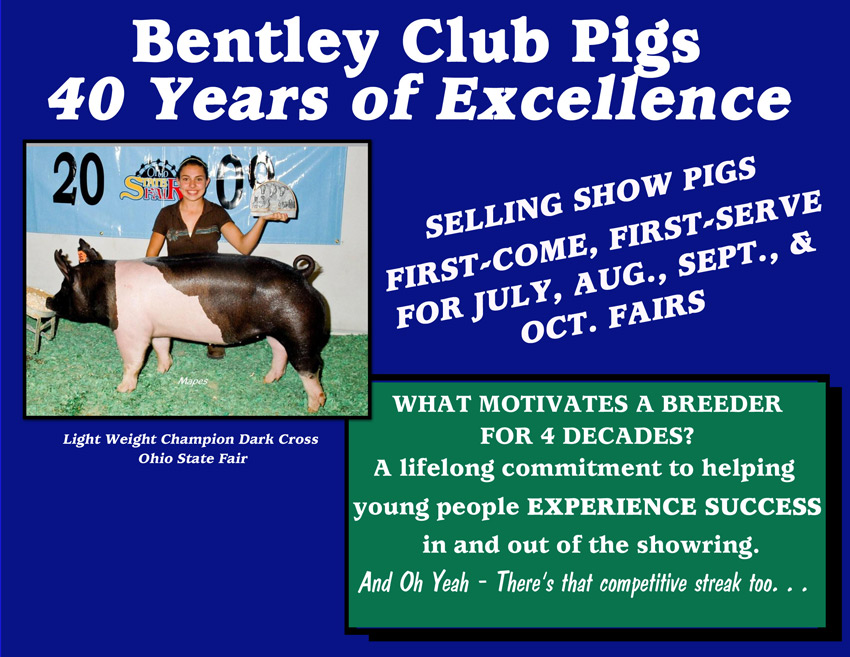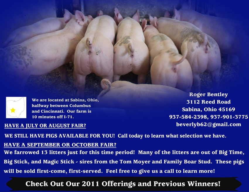 ![]() Extra G (X-bred) Roger Bentley Introducing our new herd boar Extra G, sired by Super X. He is extra heavy boned, extra wide-based, extra heavy muscled, and he is extremely correct on his feet and legs. We think he is Extra Good. We are excited about our offerings sired by this great boar out of Whitman's Super X boar.